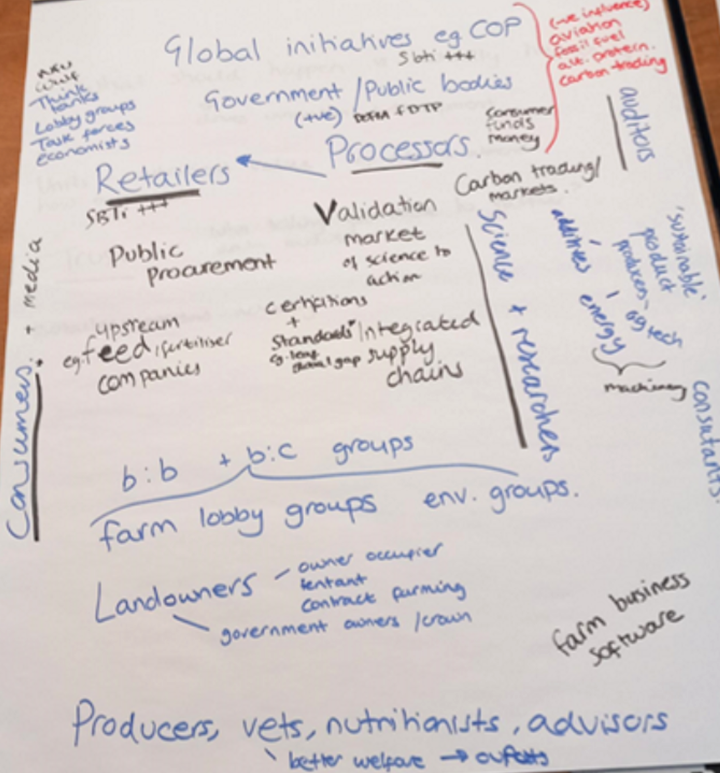 Two workshops at Harper Adams and Cranfield University bought together a diversity of people to hear about the project and share their views. Using a ‘world café’ format, there were enthusiastic discussions about the key players in the farm GHG accounting ’ecosystem’, the level of knowledge and understanding about GHG accounting and calculators, and whether farmers and advisers outside supply chain contracts were losing out on opportunities for support and learning.