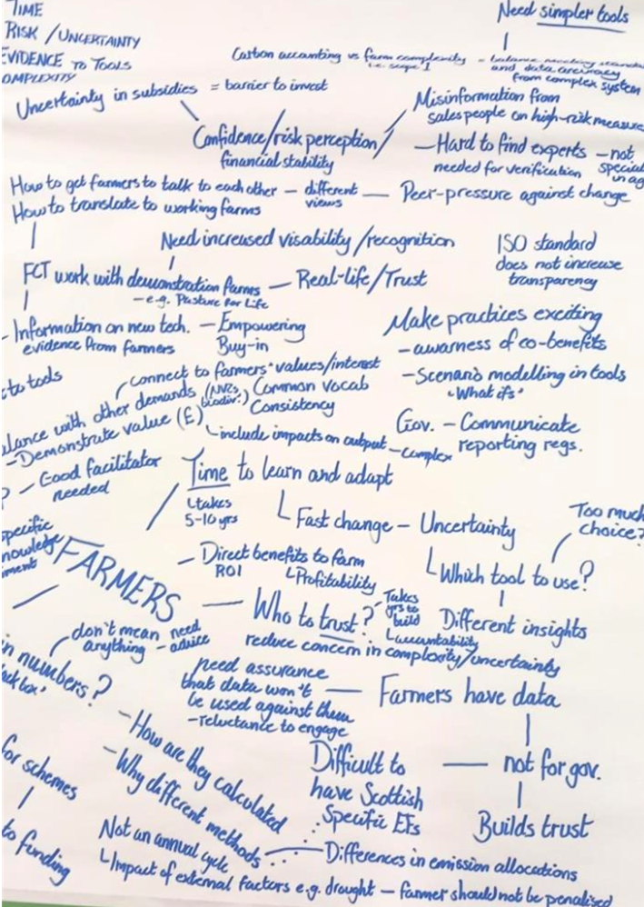 A wide range of Scottish stakeholders turned out for LUNZ Footprint’s workshop at Scotland’s Rural College (SRUC). Debates centred on the key players in the farm GHG accounting ’ecosystem’, the level of knowledge and understanding about GHG accounting and calculators, and whether farmers and advisers outside supply chain contracts were losing out on opportunities for support and learning.